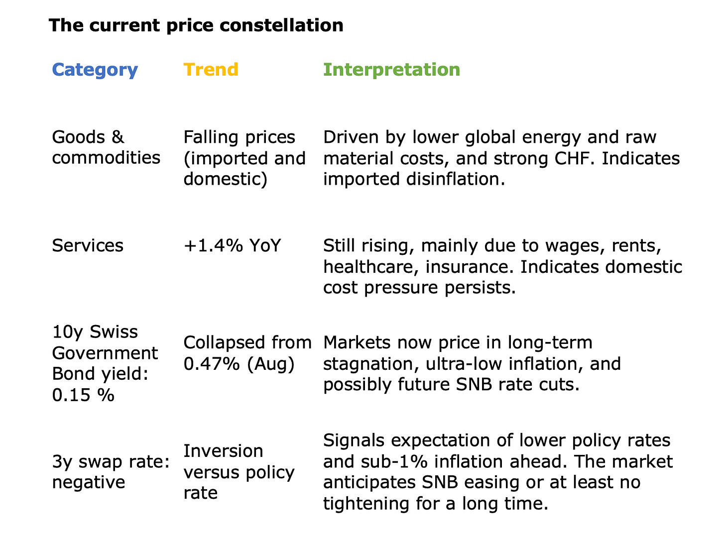 Falling goods prices are imported deflation: the CHF’s strength and weak global demand reduce tradable prices.